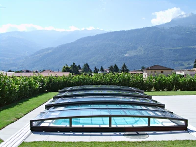 The CORONA™ pool enclosure is the lowest dual-track system designed to keep your pool clean and warm without obstructing the view of the garden. Its design combines vertical, very low side walls with a subtle arch, ensuring both function and aesthetics.