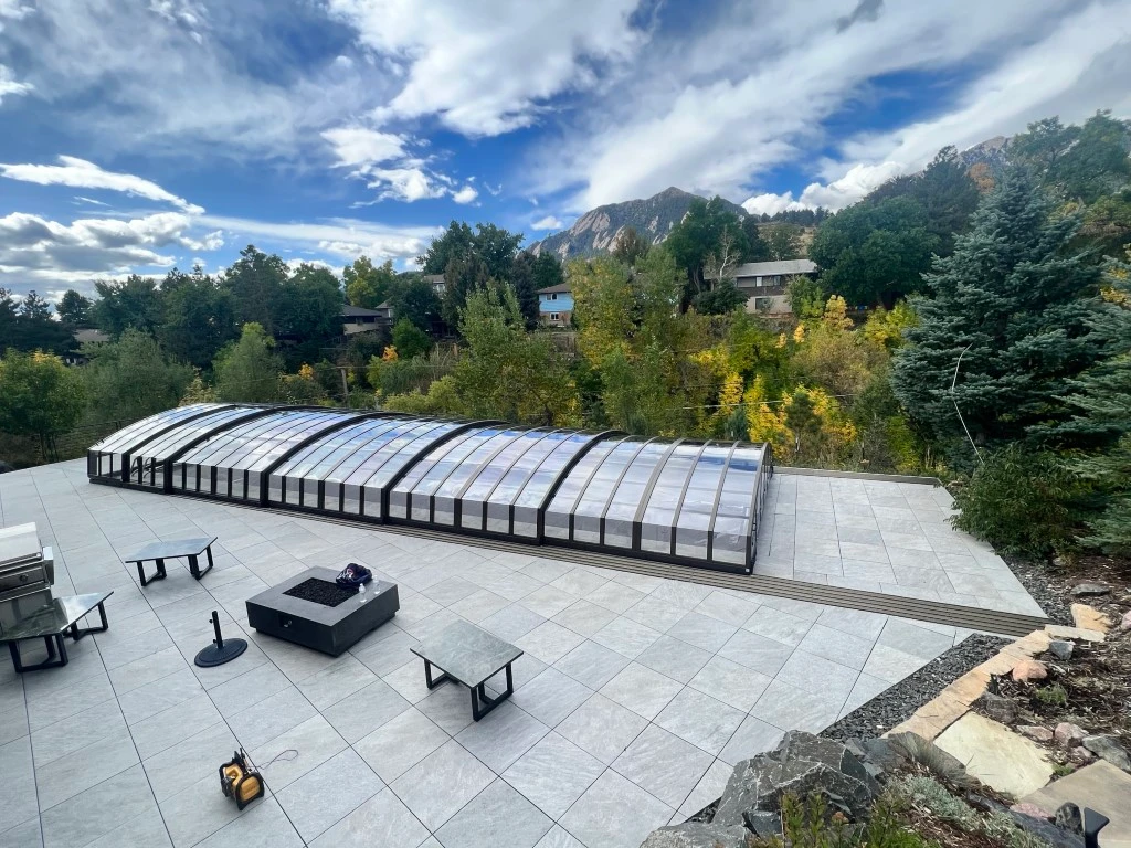 The IMPERIA NEO™ pool enclosure is a low-profile solution with a modern design that effectively protects your pool from debris and adverse weather without disturbing the garden's aesthetics.