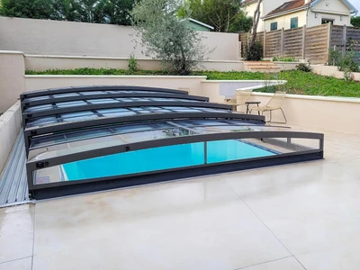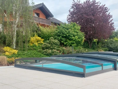 The AZURE™ Angle pool enclosure is the lowest model in the AZURE range, combining an arched roof with slanted walls. Its modern design fits any garden and includes compact polycarbonate panels with UV protection. Available in silver or anthracite, height ranges from 0.59 to 0.85 m.