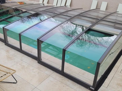 The AZURE™ pool enclosure is a medium-height solution with an elegant design, using a single radius of aluminium profiles. It offers a choice of infill between single-chamber or compact polycarbonate and is available in silver or anthracite colour.