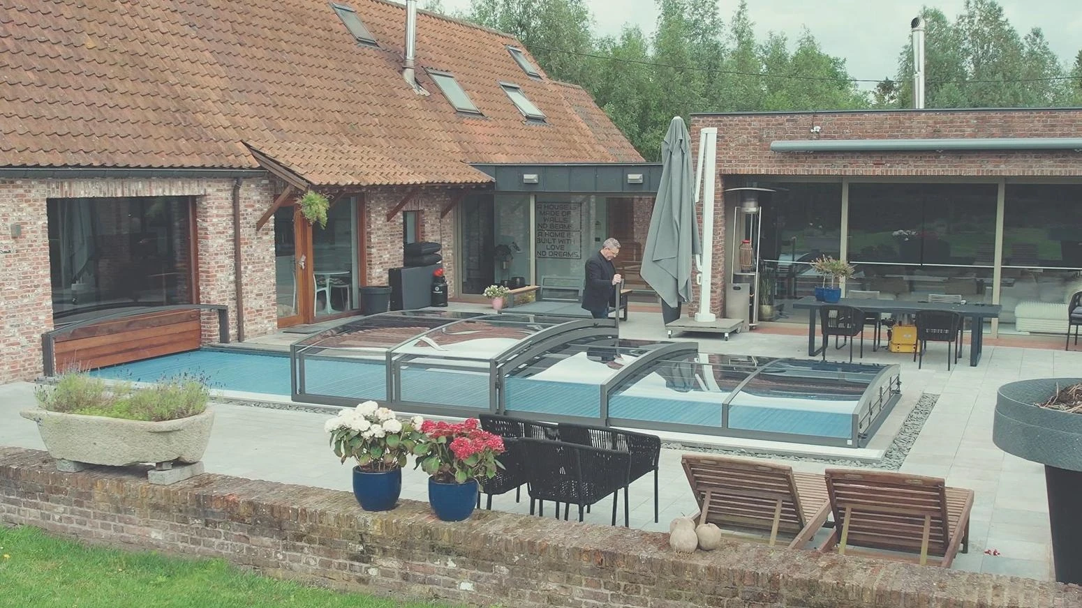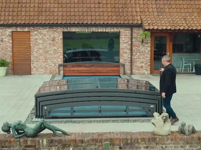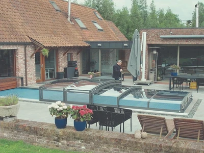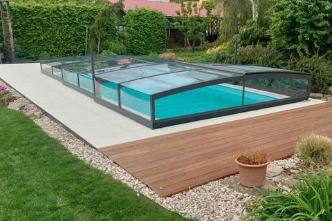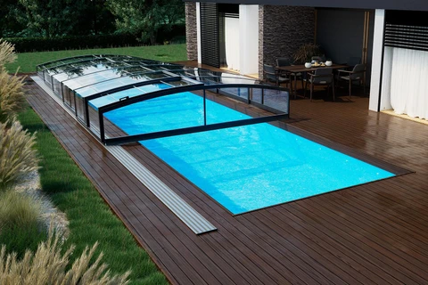The VIVA™ pool enclosure by Alukov is a low-profile solution with a single-track system, allowing barrier-free access from three sides. This modern design protects the pool from dirt, speeds up water heating and maintains temperature overnight.