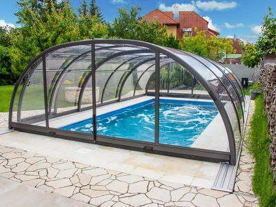 The TROPEA NEO™ pool enclosure represents the ideal compromise between the spacious LAGUNA NEO™ model and the low ELEGANT NEO™. Its structure creates a spacious hall, allowing free movement of people in the central part of the enclosed space. The walls of the enclosure can be made of compact polycarbonate, which is as transparent as glass, allowing for an unobstructed view of the garden and supervision of children while they play. This allows the enclosure to blend seamlessly with the surrounding nature.