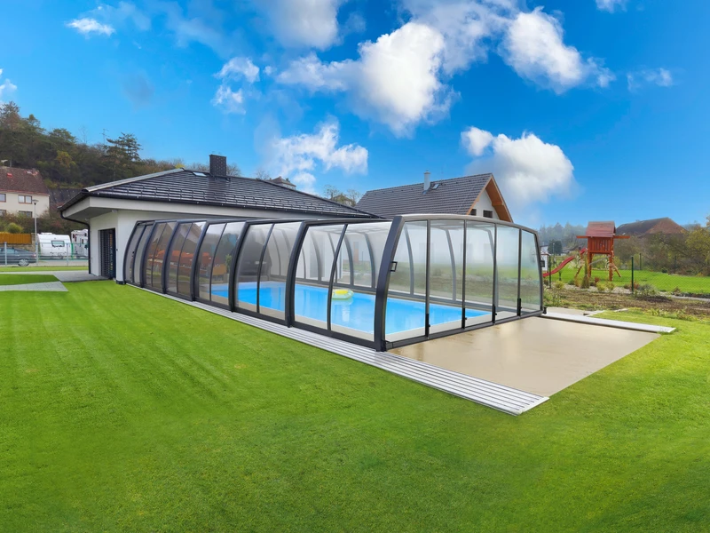 The OMEGA™ pool enclosure by Alukov features a unique design reminiscent of the Greek letter omega. Its arched side walls create a fully walkable space around the pool while preserving garden aesthetics.